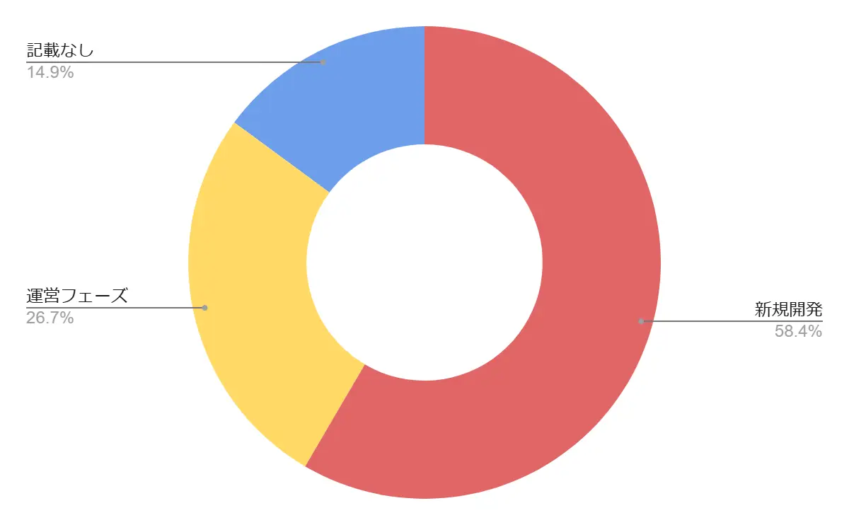 今期は「新規開発案件」が58.4%と大幅に伸長しました。世界観の根幹を担うコンセプトアートや、新規IPのキャラクター原案、0からのUI/UX設計など、クリエイティブの「立ち上げ」に関わるチャンスが豊富です。運営フェーズ(26.7%)では、既存タイトルの追加衣装デザインやバナー制作、イベントアセット制作が安定した需要を支えています。