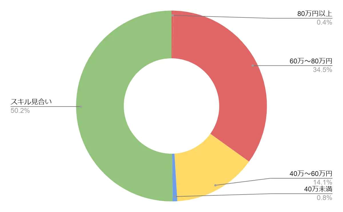 今期は「スキル見合い」が約半数(50.2%)を占める結果となりました。これはデザイナーの技量による振れ幅が大きいためですが、価格提示がある中では「60万〜80万円」のレンジが34.5%と圧倒的ボリュームゾーンです。